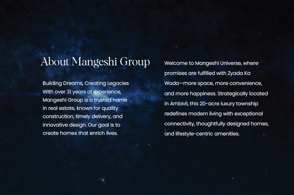 Total Land Parcel: 23 acres Project Name : Mangeshi Star 2 G+7 Storey Projected Possession December 2026 Project Configuration: 1BHK Carpet: 462Sq.Ft Starting Price: ₹29.99Lacs Onwards